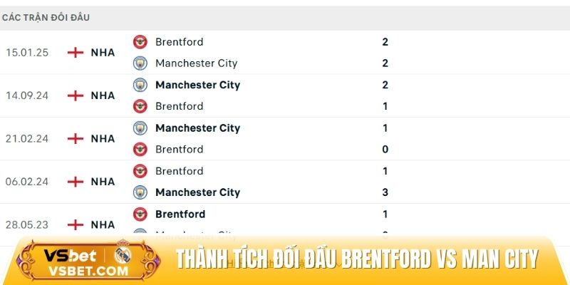 Đôi bên trong quá khứ cũng không phải là cặp đấu có quá nhiều duyên nợ, nhất là khi Brenford mới trở lại EPL trong những mùa giải gần đây. Cả hai đã có 18 trận đối đầu trên mọi đấu trường, trong đó Man City là cái tên hoàn toàn áp đảo với 10 lần đánh bại đối thủ. Trong đó con số của Bầy ong chỉ là 6 chiến thắng, cùng với 2 lần cầm chân thành công.