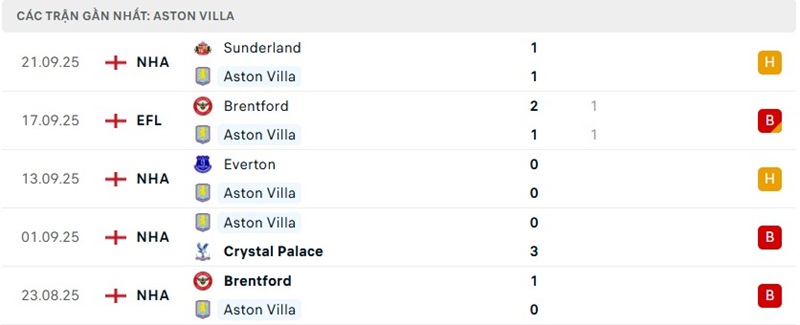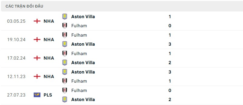 Thành tích đối đầu giữa Aston Villa vs Fulham