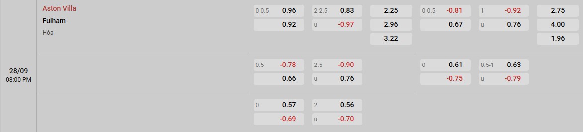 Aston Villa vẫn đang là đại diện được đánh giá cao hơn với tỉ lệ cược chấp châu Á là 0.25 bàn thắng. Fulham cũng là miếng mồi ưa thích của họ ở Premier League nhưng ở thời điểm này, Villa sẽ không thể tự tin chơi áp đặt thế trận khi chưa có sự đồng bộ giữa các tuyến. Đây chắc chắn vẫn là trận cầu đầy khó khăn dành cho thầy trò Unai Emery.