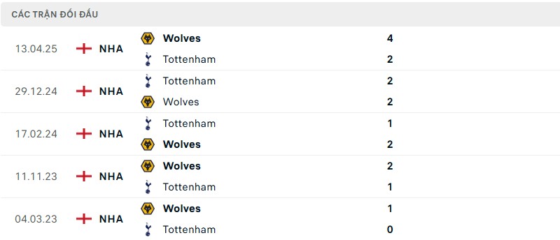Thành tích đối đầu giữa Tottenham vs Wolves